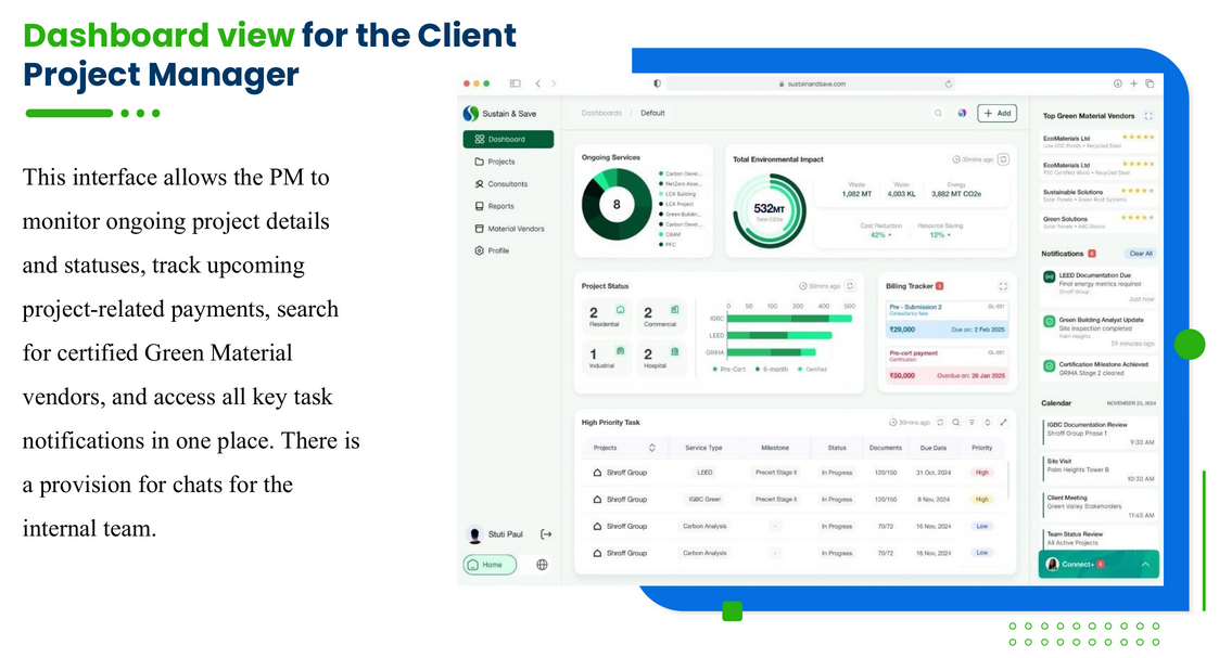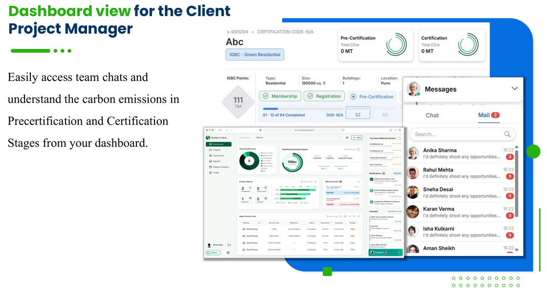 The belief that sustainability is time-consuming, costly, and complex, with endless calculations and evolving regulations, is prevalent. But Sustain and Save is here to reimagine sustainability with AI for the built environment. Introducing Sustain and Save: an AI-powered, cloud-based platform designed to simplify sustainability for builders, manufacturers, facility managers, and beyond. Our mission? To guide you seamlessly through your net-zero journey, from strategy to execution, enabled through our platform. Sustain and Save, has developed a robust platform which helps clients navigate complex data, reach compliance, collaborate effectively, and ultimately enable real progress toward net zero and responsible growth. Our platform solves the bigger problems of Data fragmentation & stakeholder data isolation, Revolving regulatory landscape, Inaccurate emission evaluation, Material sourcing challenges , lack of implementation oversight ,High implementation costs, Documentation constraints and Compliance over sustainability.