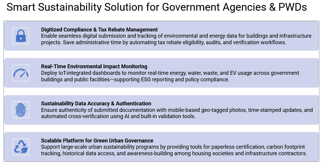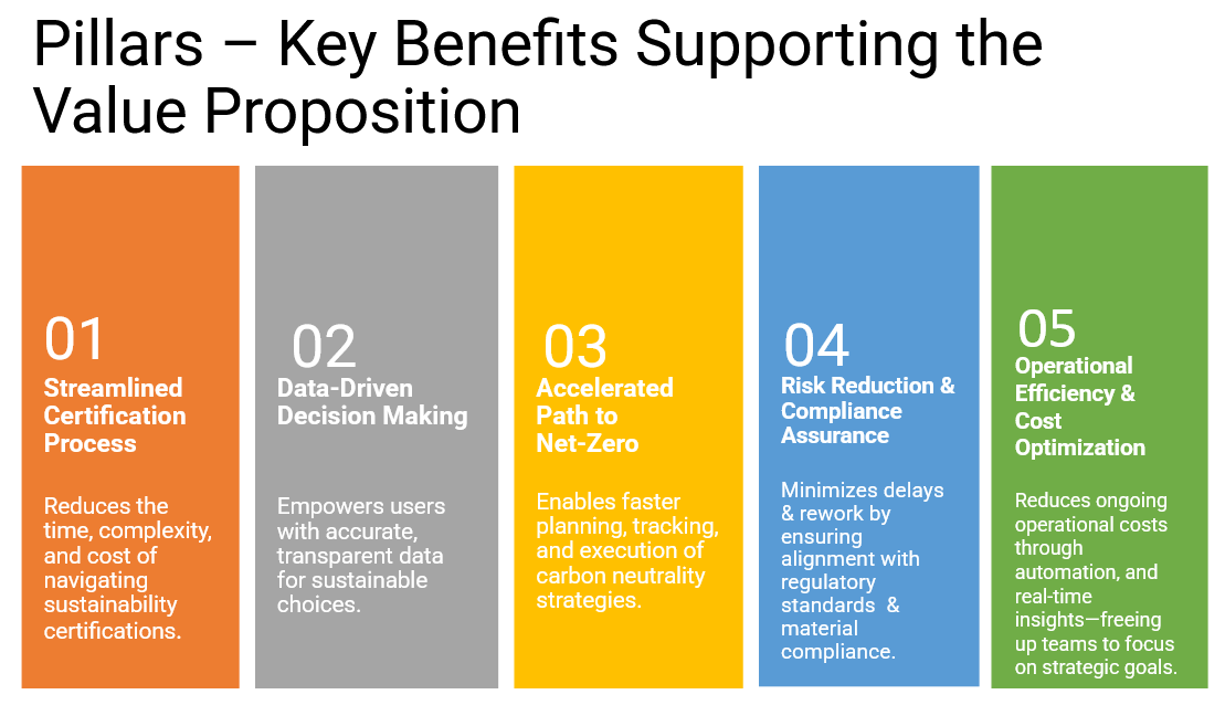 Reduces the time, complexity, and cost of navigating sustainability certifications. - Operational Efficiency & Cost Optimization